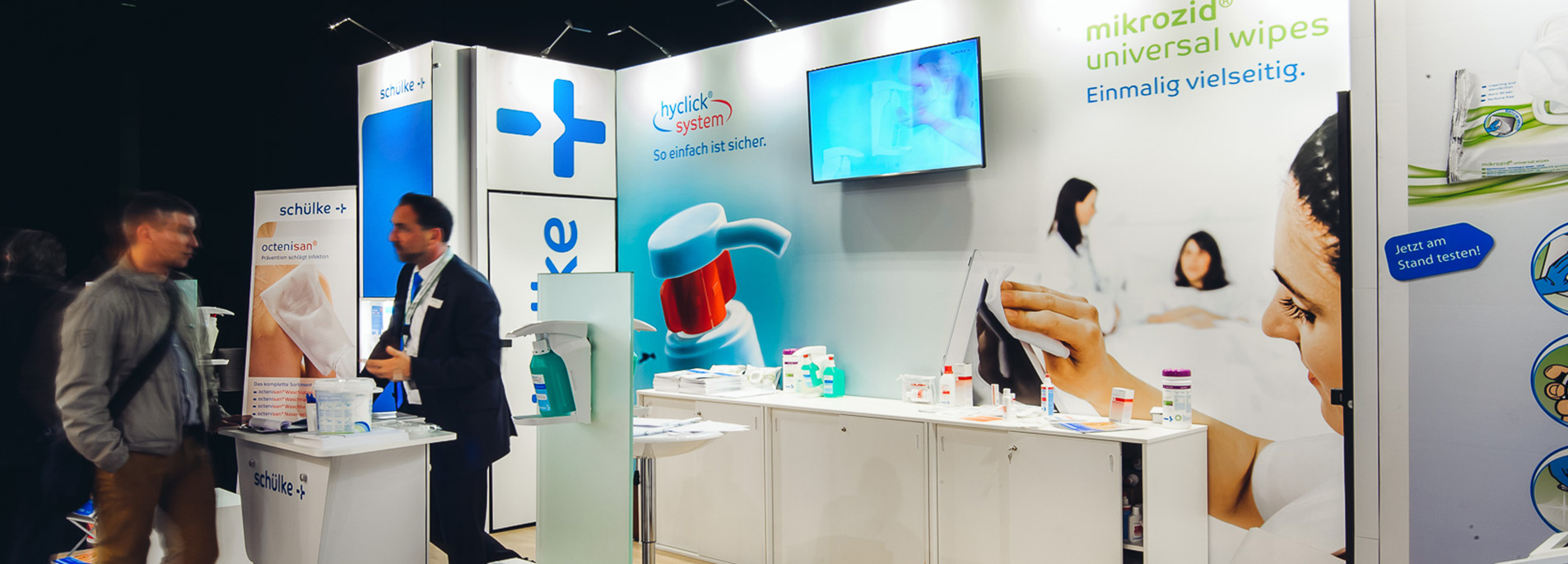 Die Schülke & Mayr GmbH hatte diesen modularen Messestand erstmalig auf dem DGKH Kongress in Berlin eingesetzt. Mittlerweile wird dieser Messestand mit unterschiedlichen Stoffgrafiken für viele verschiedene Messeauftritte eingesetzt. Durch die modulare Bauweise ist der Messestand problemlos an andere Standgrößen anpassbar.
